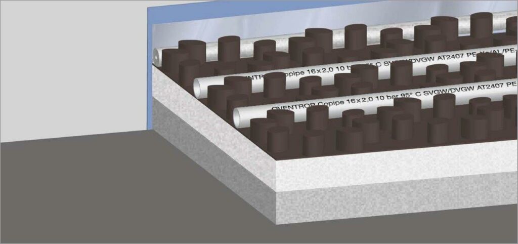 Die Noppenplatten werden auf den Rohbeton bzw. falls erforderlich auf die Zusatzdämmung aufgelegt. Das FBH-Rohr wird dann einfach zwischen die Noppen eingeklemmt.